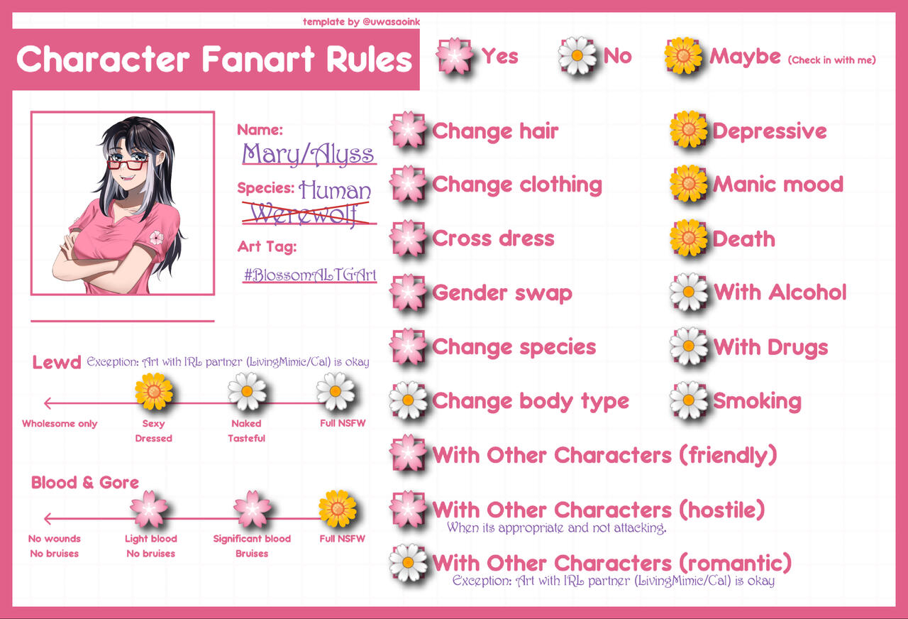 🌙 Name: Mary🌸 Alias: Alyss (Current Pename) or Blossom (Minecraft Character Name)🌙 Gender: Greygender (Physically female)🌸 Pronouns: She/Her, They/Them preferred, but I will answer to anything as long as I know you are talking to me.🌙 Age: Old enough to know I don't need to answer that... but if you insist... 28🌸 Species: Totally... Totally human, you don't need to ask about that right?🌙 Hobbies: Streaming (duh), gaming, reading, drawing, writing, crafts, knitting, cooking/baking, and probably a lot more that I can't actively think of at the moment.🌸 Fans Name: Lovelies🌙 Art Tag: #BlossomALTGArt🌸 Oshi Mark: 🌸 🌙